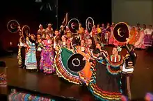 Traditional folkloric costume varies across each Mexican region. The attire in the Federal District of Mexico reflects the traditional Spanish influence while the Yucatán region reflects indigenous traditions.[9] Northern Mexico folkloric costumes also have their unique style—the costumes from the Jalisco region in Mexico have women wear brightly colored ruffled skirts that are trimmed with ribbons and ornate hair pieces. The region of Veracruz instead has women wear beautiful white dresses that are full of lace. The coastal region of Mexico, specifically Sinaloa, has women wear lighter and more colorful dresses. Generally, male dancers wear black slacks; a black, wide brimmed hat (sombrero); and a red belt and tie.[7] The Mejicas incorporate the different styles each Mexican region represents in their costume attire for performances. Based on what region the members of Los Mejicas will perform, they create their own choreography.[5] Each costume is unique and is used in different ways depending on the region.