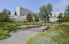 Despite post-war reconstruction plans for only a partial reconstruction of the church and for a great realist market, many houses and buildings were demolished and only Próżna Street exists from the old ghetto. The church was rebuilt and from 1966 to 1967 a new post-modern Jewish Theatre building. designed by Bohdan Pniewski, was built. The synagogue wasn't rebuilt, and in its place is the 44-storey Cosmopolitan Twarda 2/4 apartment building. There is a monument to the Polish underground in the center of the square.