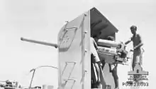 The corvette was initially fitted with a 12-pounder gun as primary armament; this was later replaced by a 4-inch (100 mm).[1][10] Three 20-millimetre (0.79 in) Oerlikons made up the secondary armament.[1] The aftmost Oerlikon was later switched out in favour of a 40-millimetre (1.6 in) Bofors.[1] An assortment of machine guns were carried for close-in defence, and depth charge throwers and rails were fitted for anti-submarine warfare.[1]