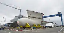 Prince of Wales was assembled at Rosyth from 52 blocks built by six shipyards around the UK. Construction began on 26 May 2011 with the first steel being cut at Govan shipyard by Defence Secretary Liam Fox.[26] In September 2014, Prince of Wales reached a final assembly phase when hull blocks LB02 and LB03 were floated into 1 Dock of Rosyth dockyard, Scotland.[27]