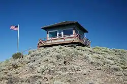 The United States Forest Service built a fire lookout on Hager Mountain and began manning it full-time in 1915.[17][18] The original lookout was replaced with a new structure in 1954. The current lookout is a 14 feet (4.3 m) by 14 feet (4.3 m) one-room cabin with large glass windows on all four sides. From it, the forest guard has a 360 degree view of the surrounding landscape. The Forest Service mans the lookout from June through October each year. There is a dirt road leading to the summit. The road is used only by the lookout on duty; it is not open to the public.[11][16]