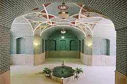 In the basement, there is a Howz-Khaneh (a large room with a small pool with a fountain in the middle) ornamented with colorful bricks and a vault. Other parts of the house are connected together through a hall. The building was ornamented with wooden-worked windows (called Orosey), stuccoes, colorful glasses, brickworks and paintings. The main room (Shah neshin) is one of the most attractive rooms of the house.