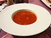 Being quite different from its Russian origin, the Chinese-style borscht (Chinese: 罗宋汤; pinyin: luósòng-tāng; lit. 'Russian soup'), originated in Harbin, close to the Russian border in northeast China, and has spread as far as Shanghai and Hong Kong.[8] A Shanghai variety appeared when the Russian emigres settled down in the former French Concession in the early 20th century. The recipe was changed by removing beetroot and using tomato paste to color the soup as well as to add to its sweetness, because Shanghai's climate was bad for planting beets and the soup's original sour taste was alien for the local people. Later, cooks usually fried the tomato paste in oil to reduce its sour taste, then put white sugar in the soup to make it both sour and sweet. Alternatively, pre-sweetened ketchup can be used instead. Likewise, cream is replaced by flour to generate thickness without inducing sourness. Most recipes contain beef and its broth, potatoes, and leaf vegetables; Hongchang sausage and worcestershire sauce is sometimes added as well. As more and more people made borscht at home, its recipes changed to please the different tastes of its makers, occasionally taking on the influence of mirepoix or minestrone with the inclusion of carrots, celery, onions, and bay leaves. The soup is often accompanied by rice.[9]
