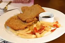 The Shanghai-style fried pork chop is a local variety of breaded cutlet. It is particularly popular as street food. Like in tonkatsu, the meat is tenderized and flatten by beating with the back of a knife.[10] The pork chop is coated with bread flour before being fried to avoid too much greasiness and to be crispy outside but tender inside. Back to the old days when supplies were badly needed in Shanghai, soda crackers were crushed to replace bread flour, which produced a different unique flavor.[6] In Shanghai, the pork chop is served with the local là jiàngyóu sauce, a localized version of the British Worcestershire sauce.[11]