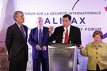 The Halifax Forum is attended by international government and military officials, academic experts, authors and entrepreneurs.[165][166][167][168] Prominent political participants include Ministers, Senators and Members of Parliament. The ministers included John Baird, Steven Blaney, Scott Brison, Kent Hehr, Peter MacKay, Rob Nicholson, Harjit Sajjan, and Vic Toews from Canada, as well as Chuck Hagel, Robert Gates, Leon Panetta, and Janet Napolitano from the United States. From Europe the ministers Michael Fallon from the United Kingdom, Karl-Theodor zu Guttenberg from Germany, Pieter De Crem from Belgium, Jeanine Hennis-Plasschaert from the Netherlands, Jean-Yves Le Drian from France,[169] Pedro Morenés from Spain, Guy Parmelin from Switzerland,[27] Milica Pejanović Đurišić from Montenegro, Hannes Hanso,[170] Nikola Poposki and Zoran Jolevski from Macedonia, Gunnar Bragi Sveinsson from Iceland, Nicolai Wammen from Denmark, Haki Demolli from Kosovo, Tina Khidasheli from Georgia, Mimi Kodheli from Albania, Juozas Olekas from Lithuania, and Jüri Luik from Estonia[171] are among previous Halifax Forum participants. Also, ministers Ehud Barak and Moshe Ya'alon from Israel, Juan Carlos Pinzón Bueno and Luis Carlos Villegas from Colombia, Salvador Cienfuegos Zepeda from Mexico,[27] Rodrigo Hinzpeter from Chile, Wayne Mapp from New Zealand, Abdul Rahim Wardak from Afghanistan and Delfin Lorenzana from Philippines[27] attended the forum.