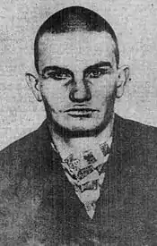 With fellow convict David Merrill he escaped on June 9, 1902, shooting and killing corrections officers Thurston Jones Sr.,[5] Bailey Tiffany,[6] Frank Ferrell[7] and three civilians in the process. His claim to infamy is the size and scope of the manhunt and the extensive media coverage of same. He evaded capture for a month, mostly taking refuge in the Seattle, Washington, area. On June 28, 1902, an argument broke out between him and Merrill, which ended in a duel. Tracy cheated during their duel and spun around early, and Merrill was killed. His body was found on July 14. On July 3, 1902, he set up an ambush near Bothell, Washington, where he killed detective Charles Raymond[8] and deputy John Williams[9] during a shootout. Tracy fled, took several hostages in a residence, and engaged other law enforcement officers in a shootout. During that shootout he killed posse member Cornelious Rowley[10] and police officer Enoch Breece.[11] On August 6, 1902, in Creston, Washington, Tracy was cornered and seriously wounded in the leg during an ambush by a posse from Lincoln County. Sheriff Gardner arrived and had the field that Tracy had crawled into surrounded. Tracy committed suicide to avoid capture. The pistol Tracy used can be found on display at the White River Valley Museum in Auburn, Washington.[12] Harry Tracy's death mask is on display at the Lincoln County Museum in Davenport, Washington.[13]