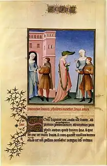 Hecyra (The Mother-in-Law)[1] is a comedic Latin play by the early Roman playwright Terence. The story concerns a young man, Pamphilus, who has a girlfriend, the courtesan Bacchis, but is forced by his father to marry a neighbour's daughter Philumena. Before the wedding took place Philumena was raped by an unknown man. When a baby is born, Pamphilus at first disowns Philumena, but in the end it turns out that he himself is the father of the baby and husband and wife are reconciled. Much of the play deals with the distress which Pamphilus's behaviour causes himself and his own and Philumena's parents. A comedic element is provided by a lazy gossip-hungry slave, Parmeno, who is made to run around on errands and is kept in the dark about what is happening. The mother-in-law in the title is Pamphilus's mother Sostrata, who is falsely accused of unkindness towards Philumena; but Pamphilus's own mother-in-law Myrrina also has an important role.