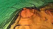 Helsby hill fort is an Iron Age hillfort overlooking the village of Helsby in Cheshire, northwest England. Helsby Hill has steep cliffs on the northern and western sides, providing a natural semicircular defence. Double rampart earthworks extend to the south and east to provide protection to those flanks. Two additional banks have been discovered enclosing a rock ledge on the cliff to the north side. Excavations last century revealed a wall composed of sand and rubble, revetted with stone to the back and front.[1][2][3] The hill has a summit of 141 m AOD, and is a prominent landmark rising above the Cheshire Plain, with fine views overlooking the Mersey Estuary and into Wales. Much of the hill is owned and managed by the National Trust.[4] The surrounding areas are well wooded to the southwest, northwest and northeast with farmland to the southeast. The hill fort is protected as a Scheduled Ancient Monument.[5]