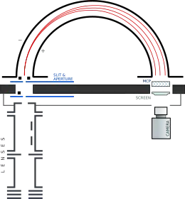 In general, these trajectories are described in polar coordinates for the plane of the great circle for electrons impinging at an angle with respect to the normal to the entrance, and for the initial radii to account for the finite aperture and slit widths (typically 0.1 to 5 mm):[4]