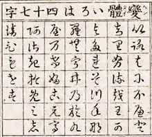 In the Japanese writing system, hentaigana (変体仮名, 変体がな, Japanese pronunciation: [hentaiɡana] or [hentaꜜiɡana], lit. "variant kana")[lower-alpha 1] are variant forms of hiragana.[2]