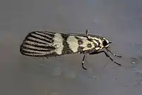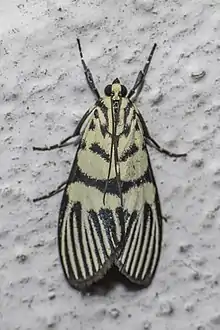 The wingspan is about 30 mm. Adults have a pattern of black on pale yellow on the forewings. The hindwings are white with a broad black margin.