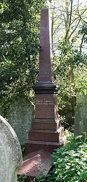 Campbell died on 19 July 1904 from a brain haemorrhage after he was injured by a horse having alighted from his brougham.[13][14] He was buried at Abney Park Cemetery, Stoke Newington, three days later.[2]