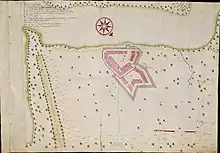 On 29 March 1720, three Dutch ships, the Kaap, the Gouda, and the Zeelandia, reached the bay.[7] The Dutch navigators, led by Johannes Steffler, were warmly welcomed by the local Batonga tribe and its chief, Mafumbo.[7] In March 1721, the Dutch East India Company purchased the land around the bay from Mafumbo and set about reconstructing the old Portuguese fort, which had fallen into ruin.[7] The repaired fort was named Fort Lydsaamheid (Dutch: "Fort Endurance").[7][8] Within three weeks of their arrival 100 of the original sailors, craftsmen, and soldiers had died of fever.[7] In August 1720, 80 new arrivals came to replace them.[7] Beginning in April 1721, it was governed by an opperhoofd as a dependency of the Dutch Cape Colony.[8] From April to 28 August 1722, when the Dutch recaptured it, the fort was occupied by pirates led by John Taylor.