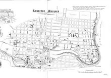 In 1850, a small town was founded next to the fort.[19] The town, like the fort, became known as Lourenço Marques. In 1871, the town was described as a poor place, with narrow streets, fairly good flat-roofed houses, grass huts, decayed forts, and a rusty cannon, enclosed by a recently erected wall 1.8 metres (6 ft) high and protected by bastions at intervals. On 9 December 1876, Lourenço Marques was elevated to village status.[5] The growing strength of the Transvaal led, to greater interest being taken back in Portugal in the development of a port. A commission was sent by the Portuguese government in 1876 to drain the marshy land near the settlement, to plant blue gum trees, and to build a hospital and a church. In 1885, the Vasco de Gama Gardens were laid out. On 10 November 1887, Lourenço Marques was declared a city by a royal decree by King Luís, who cited the settlement's material improvements and economic potential.[5]