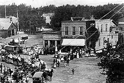 In 1853, the trustees elected Clark T. Hinman as the first president of the university and committed to raising $200,000. Hinman insisted that a university, rather than a preparatory school, be constructed first and that it should be built outside of Chicago. Following Hinman's recommendation, Lunt began to survey for land that was both north of the city and abutting railways for a new university in the areas of Jefferson Park and Ridgeville. Unable to find available land on the north shore up to Lake Forest, the committee was ready to purchase farmland to the west of the city when Orrington Lunt insisted on one final visit to the present location.[16] A 360-acre (150 ha) parcel of dry, wooded bluffs overlooking Lake Michigan belonging to a Dr. John Foster (unrelated to Randolph S. Foster) was purchased by Evans for $25,000 in August 1853 as a site for the new campus.[17][18] In 1855, the university charter was amended to declare that university property "shall be forever free from taxation for any kind and all purposes".[18] The trustees aggressively used the property-tax-exempt status to purchase more of the surrounding farms and Northwestern land holdings grew as large as 680 acres (280 ha). In 1854, Philo Judson, Northwestern's business manager charged with surveying and plotting this real estate nicknamed the land "Evanston" in honor of founder John Evans.[19] In 1857, the Illinois legislature changed the name of the village from Ridgeville to Evanston and it became an incorporated city in 1863. The university undertook a major development effort to drain the swamps, clear and grade the land, and donated or sold land to permit the construction of streets, parks, schools, waterworks, and churches.[20] Between 1860 and 1870, Evanston's population had grown from 831 to 3,062.[19]