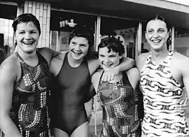Public nudity was a major concern in designing early swimwear. It was a major factor behind the non-participation of American women in the 1912 Olympics.[3] At those Games British women wore full-body silk suits of such a volume that they could be passed through a wedding ring. The suits were complemented by bras and bikini-style briefs as they became transparent when wet. Women's coaches were rare at early Olympics, and to further reduce the chances of harassment women were accompanied by chaperones.[4] Even men wore one-piece swimsuits covering the body from hips to shoulders up to the 1940s.[5] In 1928, Speedo introduced their racerback silk suit that was optimized to fit the body shape.[6][7] It uncovered the shoulder blades, which almost resulted in disqualification of Clare Dennis at the 1932 Olympics,[8] but became a norm by 1936.[9] Meanwhile, men were allowed to swim in bare-chest suits in 1936, and in briefs only at the 1948 Olympics.[6][10] In 1956, Speedo became the first company to introduce nylon[11] and in the 1970s elastane to their swimsuits that improved their elasticity, durability and water drag – 21 out of 22 records at the 1972 Olympics were broken using nylon/elastane suits.[6]