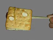This snack is made of two pieces of crackers stuffed with sticky sweet maltose in the middle, rolled up on a thin strip of bamboo.[40] |