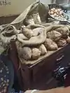 ![]() | It is cut into slices and placed on a bamboo skewer. The outer side is fried until orange colour and the inside is filled with grease and fat. |