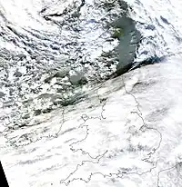 Because of the high temperature gradient between the warm and cold air masses, the cyclone underwent a phase of explosive deepening.[11] By 08:00 UTC, the low had attained a minimum barometric pressure of 977 hPa (28.9 inHg), bringing gale-force winds to much of western Great Britain.[12] The minimum pressure further dipped to 957 hPa (28.3 inHg) around 12:00 UTC, with maximum sustained winds of at least 105 mph (169 km/h) observed at the surface.[13][14] An overall pressure drop of 44 hPa (1.3 inHg) was observed over just 24 hours, which combined with the extreme winds earned it the label "weather bomb" by meteorologists.[11] A FAAM research aircraft had intercepted the storm on several occasions as part of the DIAMET[15] research project, providing valuable data on its wind profile, temperature and humidity.[16]