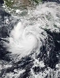 At 15:00 UTC on July 2, Bonnie crossed over into the Pacific basin, becoming the first to survive the crossover from the Atlantic to the Pacific since Hurricane Otto in 2016.[19][20] The well-defined center of circulation and banding persisted in the storm several hours later.[21] Microwave imaging indicated that an inner core developed.[22] Bonnie continued to organize, with satellite images showing a strong convective band on the western portions of the storm.[23] Bonnie strengthened into a Category 1 hurricane on the Saffir–Simpson scale by July 4 just south of Salina Cruz, Oaxaca, making it the third hurricane of the Pacific hurricane season.[24] Nine hours later, the ragged eye of the cyclone developed that was visible on satellite imagery.[25][26] Later that day, Bonnie intensified into a Category 2 system as an inner core and distinct eye became apparent and upper-level outflow became fairly well-defined.[27][28]