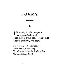 "I'm Nobody! Who are you?" is a short lyric poem by Emily Dickinson first published posthumously in 1891 in Poems, Series 2. It is one of Dickinson's most popular poems.