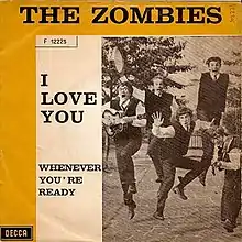 The song stayed in the vaults of Decca Records while the group embarked on their second United States tour in mid-July.[3] Upon return however, the song was finally released on 3 September 1965, when it was issued as the B-side of the group's sixth single, "Whenever You're Ready",[2][4] which had been recorded a few weeks before "I Love You".[1][5] To the surprise and disappointment of the group, the single failed to reach the Record Retailer (later UK Singles Chart) chart.[4] According to Paul Atkinson, their guitarist, they thought that the song would become a huge hit, and "lost a lot of heart" when it didn't.[2] Following the success of People!'s version, the Zombies original was re-released long after their contract with Decca had expired.[4] This release swapped the A-side and B-sides in order to promote "I Love You".[4][6] The song once again failed to chart.[4]
