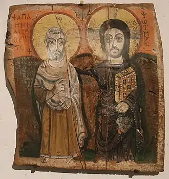 The Icon of Christ and Abbot Mena (French: L'Icône du Christ et de l'Abbé Ménas), also often known as Christ and His Friend (French: Le Christ et son ami), is a Coptic painting which is now in the Louvre museum in Paris, depicting Jesus Christ and Saint Menas together.[1] The icon is an encaustic painting on wood and was brought from the Apollo monastery in Bawit, Egypt. The icon measures about 57x57cm (22 7/16 x 22 7/16 in) and is 2 cm thick.[1] The icon has been damaged over the years, with some of the pigment missing and it has two vertical cracks running through the image, yet is still in relative great condition and can still be readily analyzed.[1]
