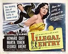 Illegal Entry is a 1949 American film noir crime film directed by Frederick De Cordova and starring Howard Duff, Märta Torén and George Brent.[2] The film and its treatment of illegal entry and unlawful residence in the United States is introduced by Watson B. Miller, the commissioner of the Immigration and Naturalization Service under President Harry S. Truman.
