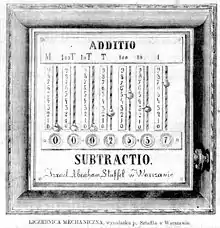 He took great interest in mechanical calculating machines. In 1845, at an industrial exhibition in Warsaw, he exhibited for the first time a calculating machine he had designed and produced. The result of ten years work, this machine was able to add, subtract, divide, multiply and obtain a square root. The machine earned a silver medal at this exhibition.[1]