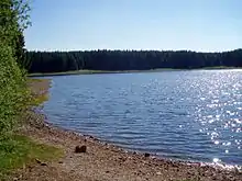 The Jägersbleeker Teich in the Harz Mountains of central Germany is a storage pond near the town of Clausthal-Zellerfeld in the county of Goslar in Lower Saxony. It is one of the Upper Harz Ponds that were created for the mining industry.