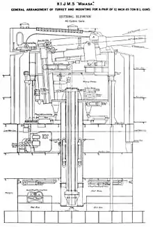 Mikasa's main battery consisted of the same four Elswick Ordnance Company 40-calibre twelve-inch guns used in all of the preceding Japanese battleships. They were mounted in twin-gun barbettes fore and aft of the superstructure which were additionally protected with armoured hoods, thus resembling true gun turrets. The hydraulically powered mountings could be loaded at all angles of traverse while the guns were loaded at a fixed angle of +13.5°.[9] They fired 850-pound (386 kg) projectiles at a muzzle velocity of 2,400 ft/s (730 m/s).[10]