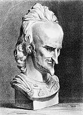 Antoine-Laurent was capable of large scale historic and figure sculpture, but Jean-Pierre's talents were better suited to portraiture, and to a smaller scale. This meant he was less likely to win prizes such as the Prix de Rome, but he was not without success. He exhibited at the Salons, and won a second class medal in 1831.[1] And from very early in his career he had begun to explore the style that would ultimately make him the better-remembered sculptor: the first of his works to gain notice was a portrait bust of the painter César Ducornet in the guise of an accursed poet.[1] Dantan's talent as a portraitist who could add expressive, romantic emotion to his subject was already apparent. (Apart from his work as a sculptor, Dantan was also a capable graphic caricaturist.)