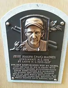 After failing to gain more than 8.3% of the votes for induction into the Baseball Hall of Fame over a 12-year period, Haines was voted in by the Veterans Committee in 1970. Frankie Frisch, a member of the VC, also shepherded the selections of his teammates Dave Bancroft and Chick Hafey in 1971, Ross Youngs in 1972, George Kelly in 1973, Jim Bottomley in 1974, and Freddie Lindstrom in 1976.[9] After the committee selected Haines, Frisch commented that Haines was "a worthy, worthy man... a great competitor, a fine fellow off and on the field."[5] Sabermetrician Bill James has listed Haines as one of ten examples of Hall of Fame inductees who do not deserve the honor.[10]