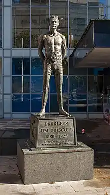Driscoll's boxing career was interrupted by World War I, where he was recruited as a physical training advisor, enlisting in 1914 in the Welsh Horse Yeomanry.[5] In succeeding years, he continued to box despite failing health, relying on his skills to keep him out of trouble. When he died in Cardiff of consumption at the age of 44, over 100,000 people lined the streets for his funeral. He is buried at Cathays Cemetery in Cardiff, Wales.[6] He authored a number of books on boxing; Text Book of Boxing, Outfighting, Ringcraft and most notably The Straight Left and How to Cultivate It, were widely printed and are still respected as instruction books of the sport today. In 1997 a statue was erected in his honour near the Central Boys' Club where he had trained.