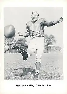 James Richard "Jungle Jim" Martin (April 8, 1924 – October 9, 2002) was an American football guard, linebacker and placekicker who played fourteen seasons in the National Football League (NFL) in the 1950s and 1960s, mainly for the Detroit Lions. He was selected to the Pro Bowl, the NFL's all-star game, after the 1961 season, and went on to be an assistant coach after his playing career. He was an All-American at the University of Notre Dame and was inducted into the College Football Hall of Fame in 1995.