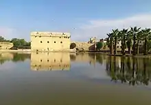 The gardens are located along the course of the local river (the Oued Fes or Oued el-Jawahir) and the historic water channels which provided water to the old city.[3] Accordingly, some historic norias (water wheels) are also located in the area: one in the eastern part of the gardens and a larger one on the western edge of the gardens.[4][7] The southern part of the gardens is occupied by a large pool. The far side of the pool is overlooked by the old ramparts of Fes el-Jdid and by a large 16th-century Saadian bastion known as Borj Sheikh Ahmed.[3]