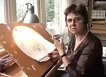 Quinn's first film Girls Night Out was completed in 1987 and won three awards at the Annecy Film Festival.[3] This film introduced the anti-heroine character of Beryl and follows her antics when she goes to see a male stripper. Beryl appeared in Quinn's next film Body Beautiful (1990) in which she is the factory union rep dealing with a macho workmate named Vince, voiced by Rob Brydon. In Dreams and Desires - Family Ties (2006), Beryl becomes obsessed with film making and is asked to video a friend's wedding. Affairs of the Art was written and produced by Les Mills and voiced by Brendan Charleson and Menna Trussler as Beryl. It was released in January 2021, and won Best Animation at its World Premiere in the Clermont-Ferrand Short Film Festival. Beryl is totally obsessed with drawing and her fixation dominates her life the entire household.[4]