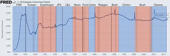 Numbers listed from 1941 and onward are BLS data[7] of nonfarm jobs (in thousands), and are shown from the year beginning and ending each presidential term. The monthly statistics are quoted from January, as U.S. presidents take office at the end of that month.