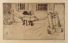 A joggling or jostling board is a long, pliable board that is supported on each end by wooden stands. The board is springy and a person sitting on it can easily bounce up and down. Sources differ on the origin;[1][2] its usage in the Lowcountry of South Carolina around Charleston in the early 19th century is however rather well-documented.