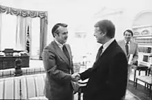 For the first four years of his term, Durkin served alongside fellow Democrat Thomas J. McIntyre. This was the first time New Hampshire had been represented by two Democratic senators since prior to the Civil War. As a member of the senate Veterans Affairs Committee, Durkin authored a successful amendment to the 1976 Veterans Affairs Authorization, which extended GI Bill benefits to veterans of the recently concluded Vietnam War. Other highlights of his Senate career included his work on energy independence, alternative energy sources, and preserving Federal lands in Alaska for future generations.[1] Durkin called for a Senate investigation into the International Brotherhood of Teamsters pension fund and its apparent ties to underworld crime.[5] Durkin introduced an amendment to the Federal Election Campaign Act (FECA), which would have provided public financing of campaigns by providing free television and radio time, postage, and telephone service to all bona fide congressional candidates.[6]