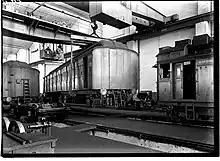 - The workshop and fitting bays were each 183 by 18 metres in size, with four tracks and three inspection pits. For the handling of bogies under overhaul there were 24 short traverse tracks and pits. Two 25 tonne cranes were installed in the lifting bay, and two 15 tonne electric cranes were provided in the workshop bay.