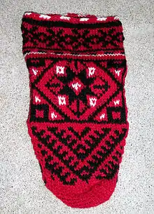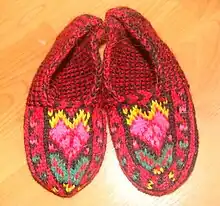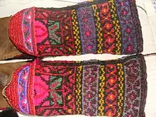 Jorabs are multicolored socks with intricate patterns, knitted from the toe-up. They are usually worn in such a way as to display rich decoration.