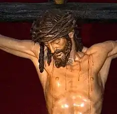 Other works were the great altars at Santa Clara in Seville and at San Miguel in Jerez, the Immaculate Conception and the realistic figure of Christ Crucified in Cristo de la Clemencìa, commissioned in 1603,[1] in the sacristy of Seville cathedral (illustration); the figure of St John the Baptist, and the St Bruno (1620); a tomb for Don Pérez de Guzmán and his wife (1619); the highly realistic polychromed wood head and hands of St Ignatius of Loyola (1610) and of St Francis Xavier in the university church of Seville, where the costumed figures were used in celebrations.