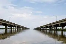 The Jubilee Parkway is a pair of parallel concrete viaduct bridges that carry Interstate 10 across Mobile Bay from the George Wallace Tunnel on Blakeley Island in Mobile, Alabama eastbound to Spanish Fort/Daphne, Alabama. The bridges are similar in design to the pre-Hurricane Katrina I-10 Twin Span Bridge near New Orleans, Louisiana. Each of the two bridges is two lanes wide, for a total of four lanes, and 7.5 miles (12.1 km) long. The parkway was completed in 1978[1] and crosses the northern portion of Mobile Bay, running roughly parallel to the nearby Battleship Parkway,[2] with which it has an interchange. It was named for the jubilee phenomenon that occurs intermittently in Mobile Bay, but is commonly referred to locally and in the media as the "Bayway".[3]