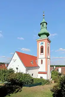The parish church is based on a simple late Romanesque/early Gothic building, which was given a Baroque appearance during the last renovation. The southern spire was also given a Baroque roof. The church's white rib vault was erected on the remains of the medieval church that had been destroyed by the Turks.
