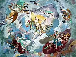 Around 1740, medieval city Schemnitz, Kingdom of Hungary (now Banská Štiavnica, Slovakia) intended to form a standard Calvary with fourteen stations in the eastern part of the city – under a hill named Ostrý vrch (Scharffenberg – this hill along with the surrounding land belonged to the family of Fritz von Friedenlieb, of Protestant religion). However, only two chapels still remain standing. The Jesuit Father Francis Perger proposed to the City Hall a project of magnificent Calvary comprising three churches and 22 chapels, probably based on the architectural design of major historian, cartographer and architect Samuel Mikoviny. The owners of the land in the year 1744 released the top of the hill with its western slope to the city in order to allow implementation of the Calvary complex as proposed by the Father Perger. After considering, the magistrate finally on 13 March 1744 agreed to, and provided the initial funding by the sum of 300 Goldens. Municipality Banská Štiavnica presented on 22 May 1744 a demand to ecclesiastical authority for approval to build Calvary according to this project under the auspices of the city of Banská Štiavnica. Archbishop of Esztergom (resident in Trnava) Imrich Esterházy (1725–1745) adopted the request and his approval reached the municipality on 13 August 1744.[1] Immediately preparation work was begun – treatments of the ground and import of materials on the site. The cornerstone was solemnly blessed by the presence of large numbers of believers and the priesthood on the Feast of Exaltation of the holy Cross – on 14 September in 1744. The first building was the "Upper Church".