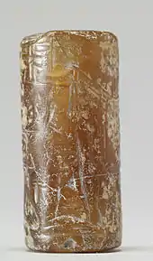 The glyptic themes experienced various evolutions during the second half of the second millennium BC, which experts divide into three or four types but whose chronology and geographical distribution are still poorly determined. The type of seal that predominated at the beginning took up the tradition of the preceding period; it associates a seated and a praying deity, with the text accompanying the image, very developed, consisting of a votive prayer; the engraved material is generally a hard stone. The next type of the kassite period is more original; a central character is depicted, often a kind of kthonic figure, a god on a mountain or emerging from the waters, or a hero, a demon, or trees surrounded by genies. The third kassite type is characterized by Assyrian influences and the presence of real or hybrid animals. The later style (also called "pseudo-Kassite"), developed at the end of the Kassite period or shortly thereafter, was engraved on soft stones and the images were dominated by animals associated with trees and framed with friezes of triangles.[88][89][90][91]