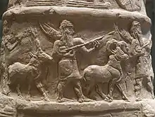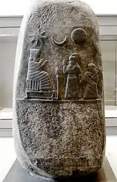 The stone sculpture of the Kassite period is represented mainly by the low reliefs decorating the kudurrus already mentioned several times, whose iconography is particularly interesting.[84] In them are symbols of the deities that guarantee the legal acts recorded on the stela, which are considerably developed by the artists of this period and replace the anthropomorphic representations of the deities, which allowed many deities to be represented in a minimum space. Nevertheless, sculptors continue to make figurative representations of characters on these stelae, as was common in previous periods. A kudurru from Meli-Shipak represents this king holding hands with his daughter, to whom he made the donation of property recorded in the stela text, and presenting her to the goddess Nanaia, guarantor of the act, who is seated on a throne. Above are depicted the symbols of the astral deities Sin (Crescent Moon), Shamash (solar disk) and Ishtar (morning star, Venus).[67]