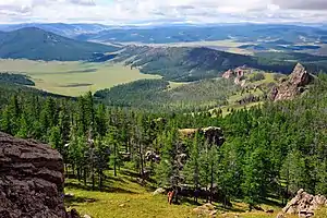 The Khan-Khukhii National Park is a separate territory from that of Khyargas Nuur National Park, which is 20 km to the south. The highest point in the park is Altan Duulga, at 2,928 metres (9,606 ft).[4] The mountain tops tend to be flat, and the slopes steep. The landscape was partially formed by glaciation.[5]
