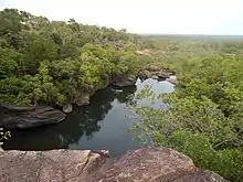 The vegetation is mostly savanna and open woodland, which vary in species composition with rainfall, underlying soils, and exposure to fires. Other vegetation types include wetlands and enclaves of monsoon rainforest.[2]